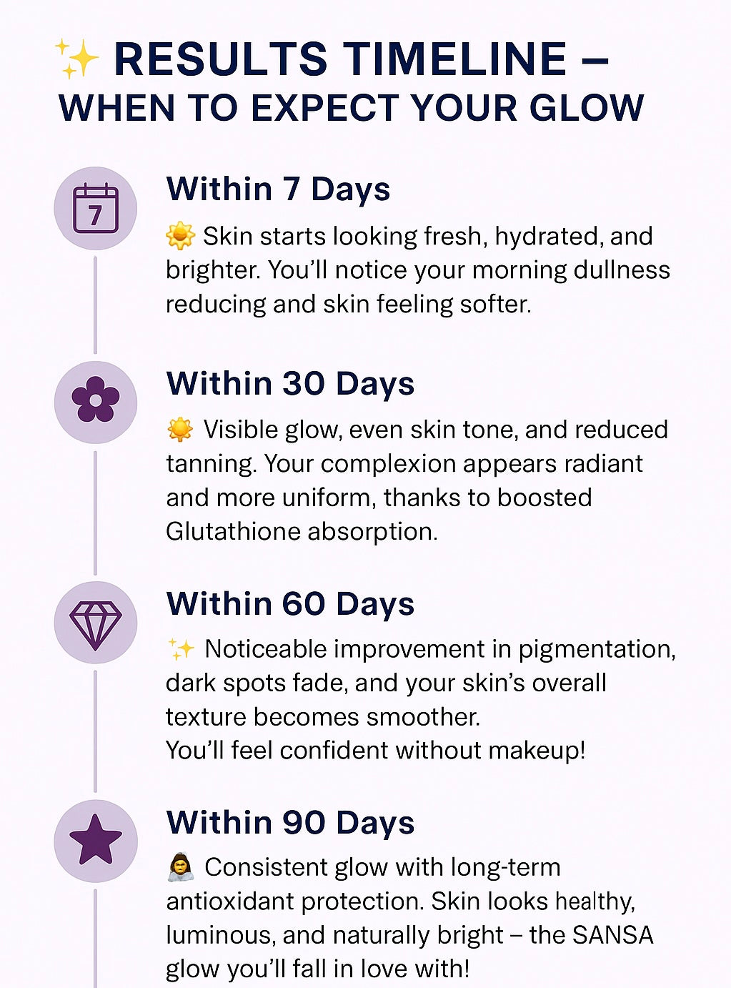 Most people notice a healthy glow and improved skin tone within 3 to 4 weeks of consistent use. Results may vary depending on lifestyle, hydration, and diet.